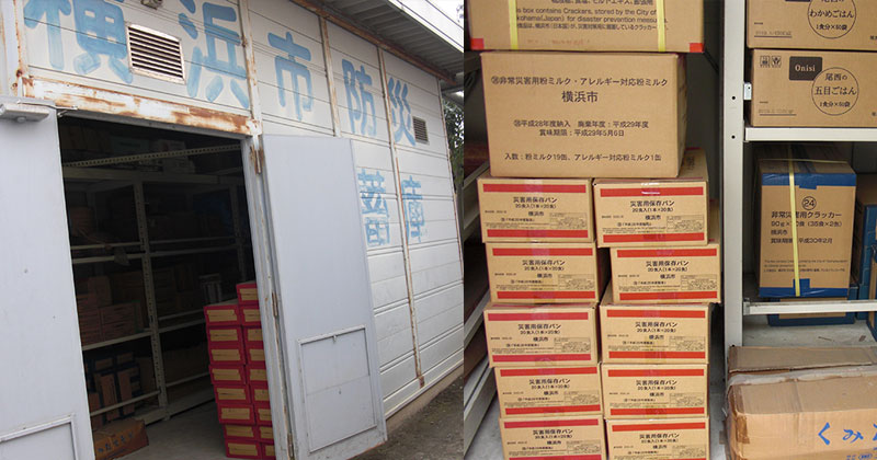 ▲防災倉庫とその中身。 非常食(パンやミルク、ごはん)が保管されています。