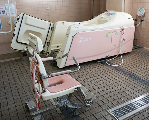 ▲特浴浴槽(上)、と中間浴浴槽(下)。入浴後は保湿成分を含んだかけ湯を行ってお肌の健康を保ちます。